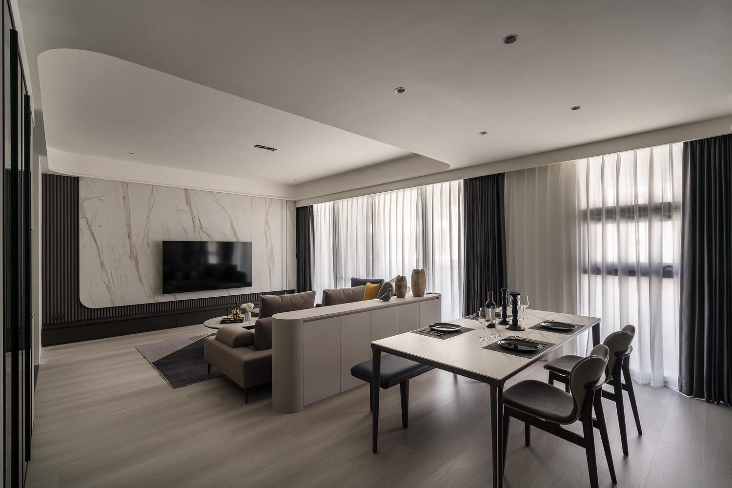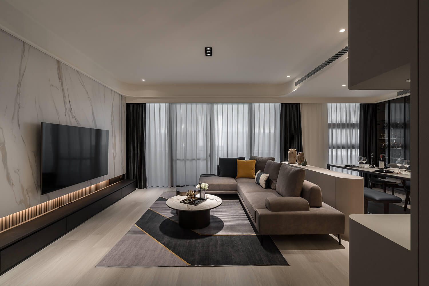 本案設計重點在於「引光入室」。我們重新梳理了客餐廳的採光動線,利用通透的材質與色調反射,讓自然光線能自由流淌於家中的每一個角落。當光線灑落在細緻的牆面紋理上,不僅放大了視覺空間感,更賦予了居所一種寧靜而優雅的氛圍。