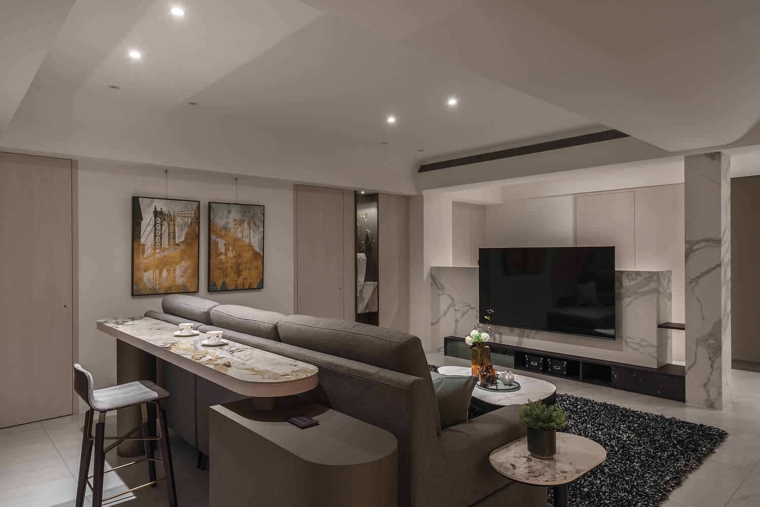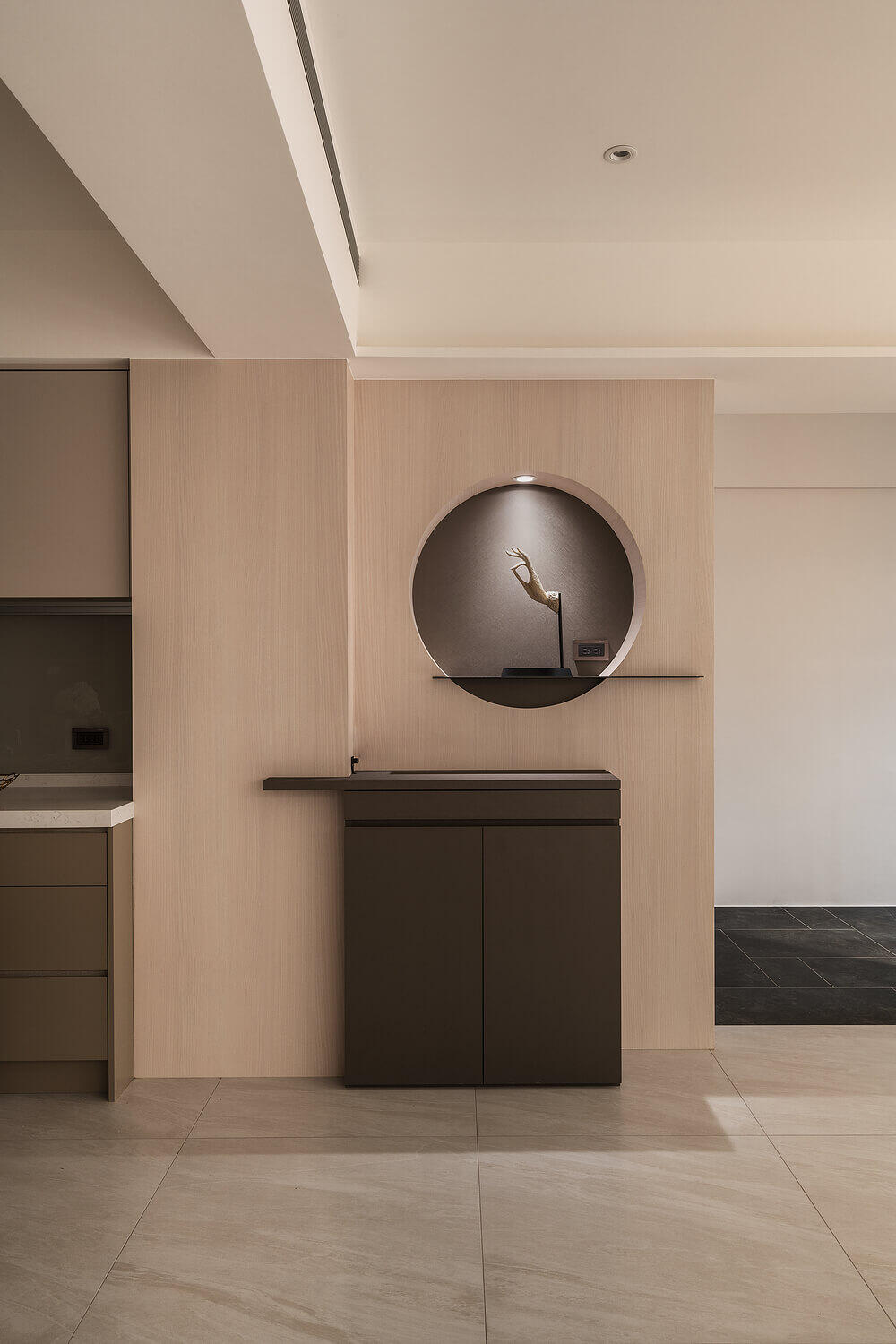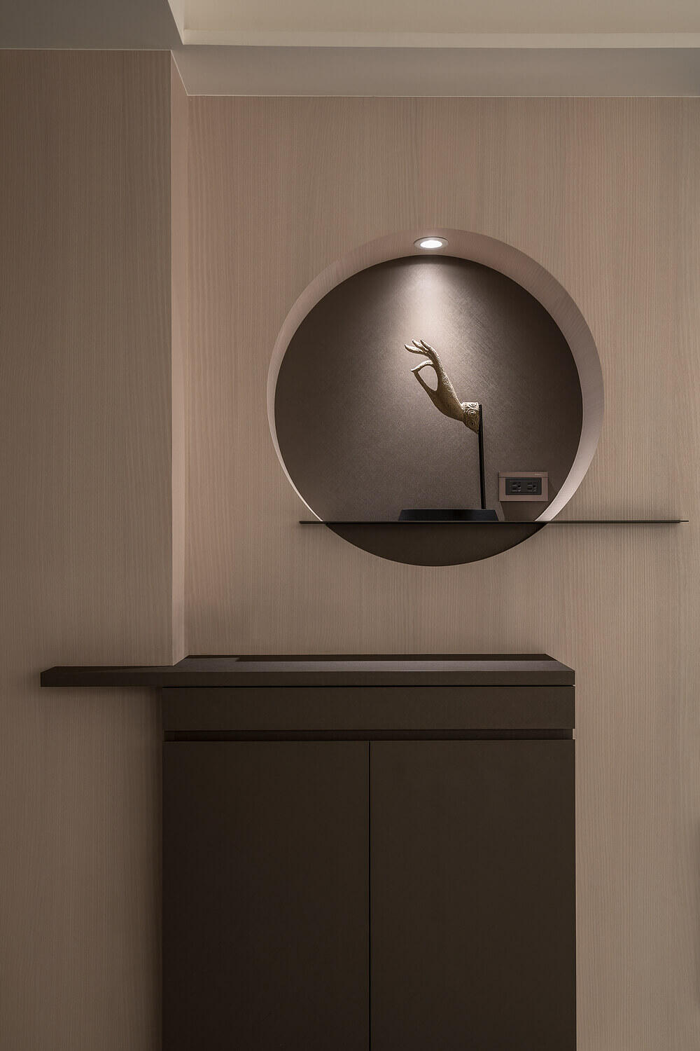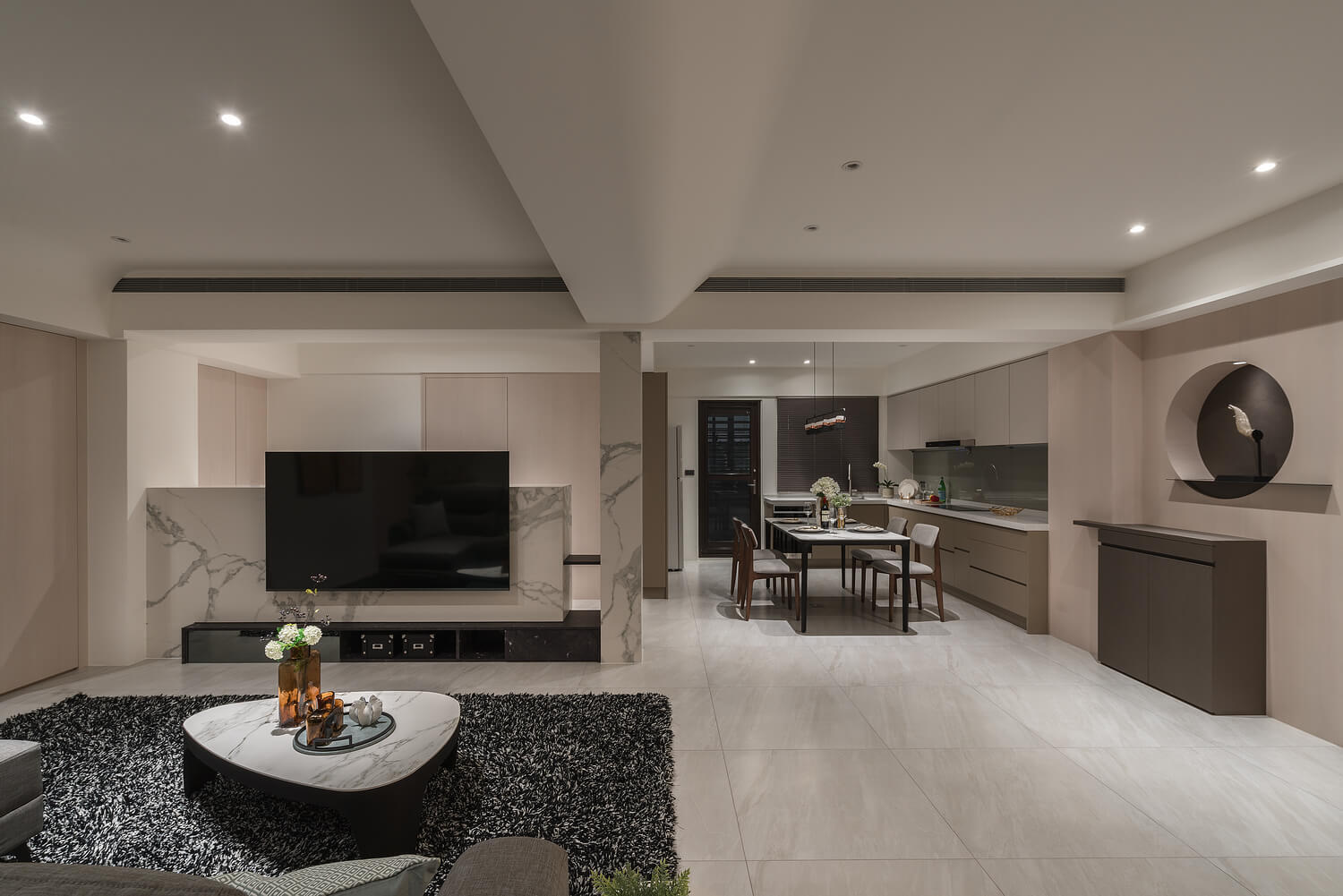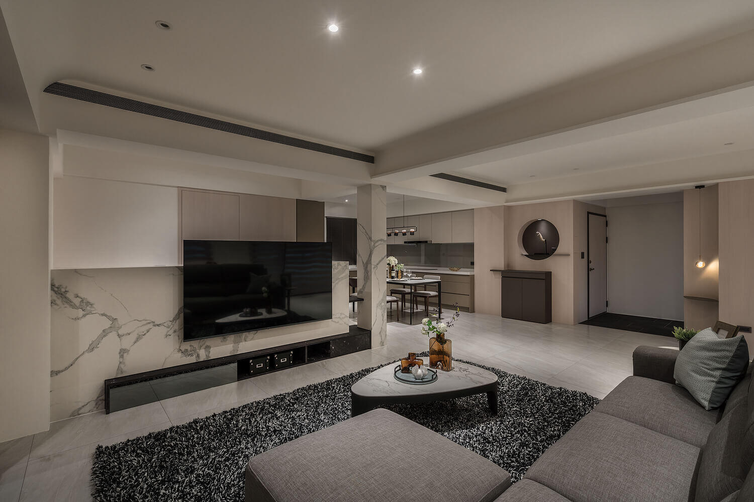 「簡約」不代表冰冷。本案設計核心在於大量運用圓弧導角與特殊塗料的細膩手感,讓空間在視覺與體感上都展現出如絲綢般的柔潤。光線在曲面上的推移,豐富了室內的層次,讓回家的每一步都成為洗滌疲累的儀式。