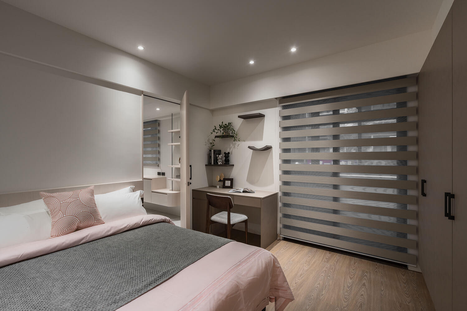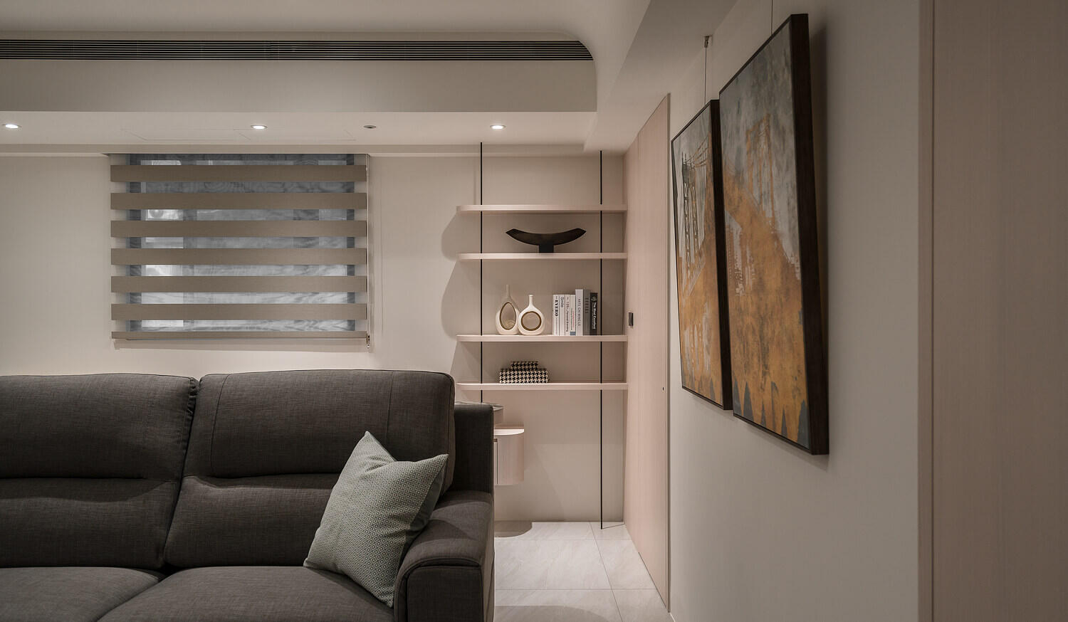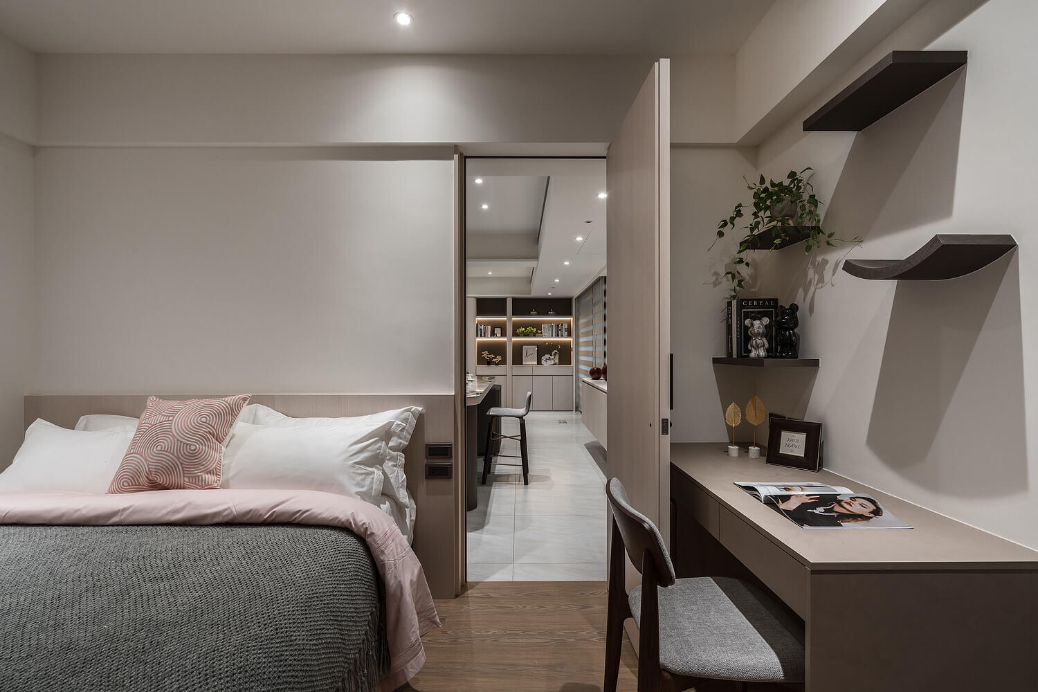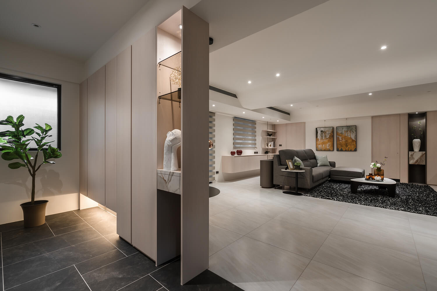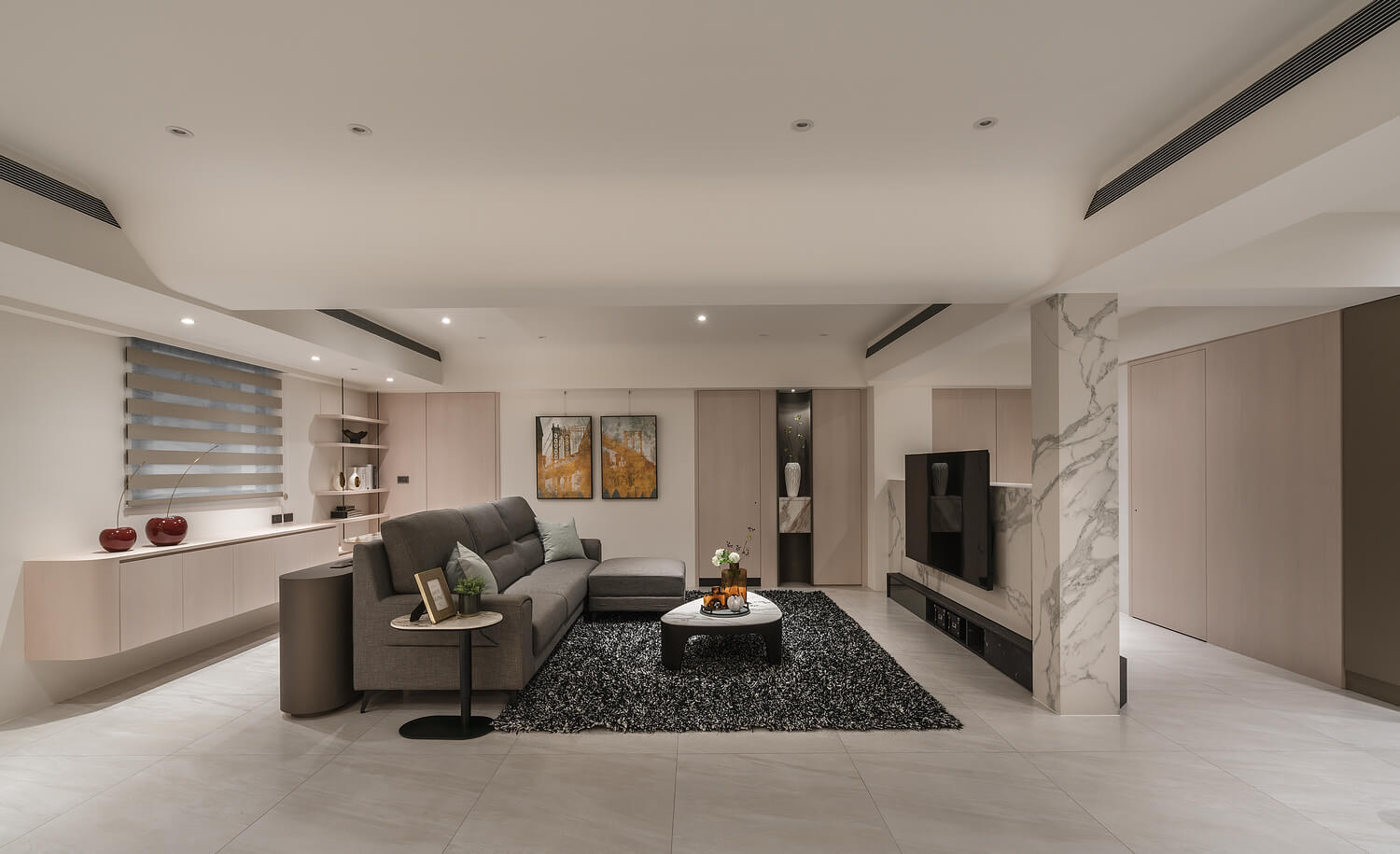 「簡約」不代表冰冷。本案設計核心在於大量運用圓弧導角與特殊塗料的細膩手感,讓空間在視覺與體感上都展現出如絲綢般的柔潤。光線在曲面上的推移,豐富了室內的層次,讓回家的每一步都成為洗滌疲累的儀式。