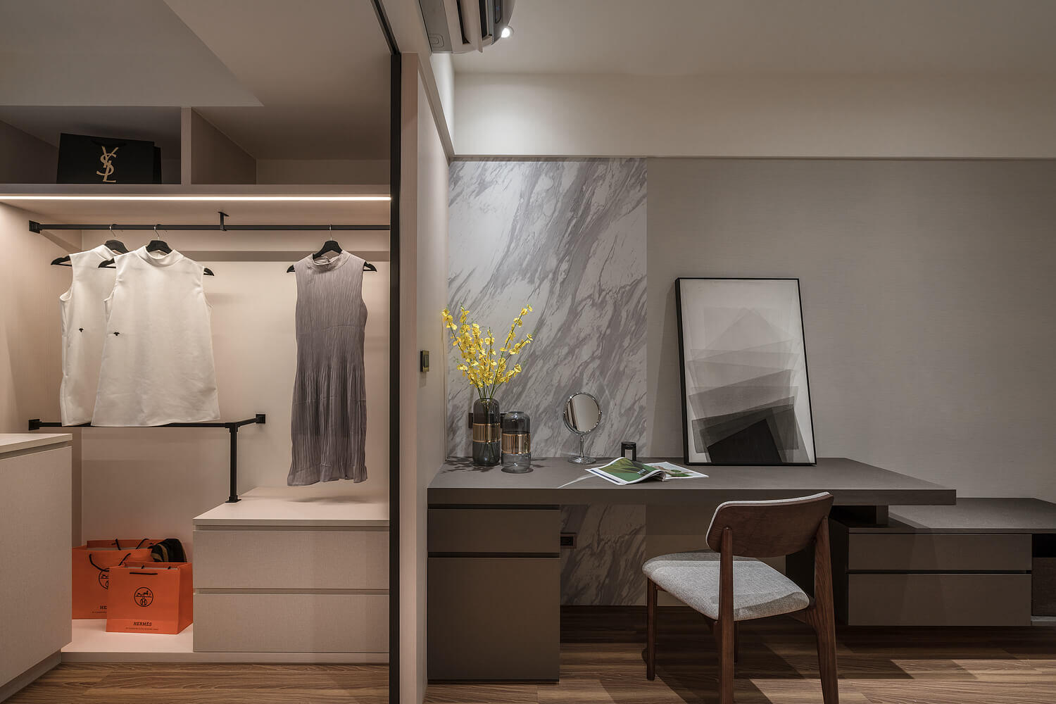 在施公館的規劃中,我們將收納需求巧妙隱藏於大面積的立面設計中。針對信義區精品宅的特性,選用低彩度的暖色調作為基底,並透過異材質的堆疊提升空間精緻度。這不僅是視覺上的簡約,更是對高品質生活方式的精準描摹。